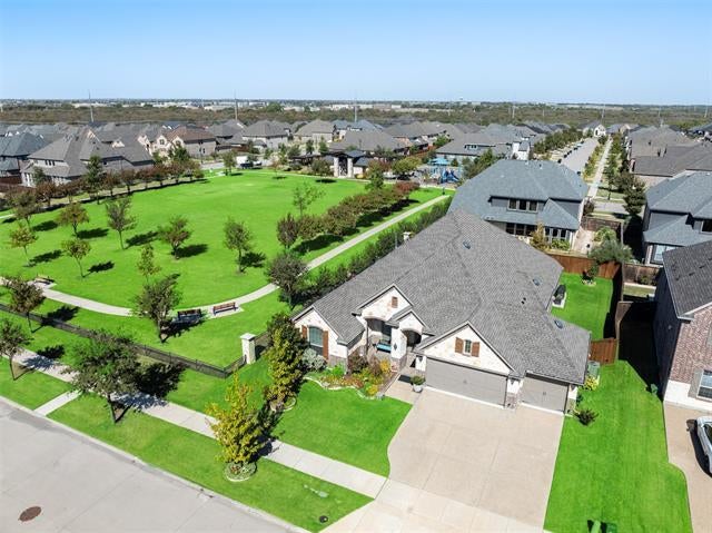 One-Story Multi-Generational Living on a Premium Greenbelt Lot! This meticulously maintained home offers an ideal layout for multi-generational living. Top rated Frisco ISD! The private in-law suite includes its own living area, kitchenette, quartz countertops, and walk-in tub. The main kitchen is equipped with stainless steel appliances, double ovens, and quartz countertops. Dishwasher in main kitchen installed 2024. Beautiful wood floors run throughout the main living areas, complemented by upgraded ceramic tile in the bathrooms and granite countertops in the primary baths. The spacious living room features a striking decorative stone fireplace—perfect for cozy evenings at home. Additional recent upgrades include an HVAC system (2025), two Honeywell thermostats (2025), and two reverse osmosis water systems. Enjoy outdoor living with an extended covered back porch, lush professional landscaping, and custom brick-and-mortar planters in both the front and back yards. Jellyfish lighting enhances curb appeal and adds year-round charm. Situated on a premium lot adjacent to a spacious greenbelt, this home truly combines comfort, thoughtful design, and modern upgrades—don’t miss this rare opportunity!