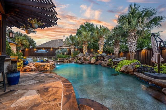 Why book a vacation when resort-style living is right in your backyard? This home is an entertainer’s dream inside and out, with palm trees, sparkling waterfalls, dramatic landscaping, outdoor lighting, a relaxing spa and an incredible outdoor kitchen and seating area—perfect for hosting gatherings. Step inside and you’re immediately greeted by a soaring two-story entry and walls of windows framing your outdoor oasis. The spacious living room boasts a floor-to-ceiling fireplace and stunning backyard views. The chef’s kitchen is a true showstopper, featuring Viking appliances, a built-in Sub-Zero refrigerator freezer and a Butler’s pantry ideal for preparing and serving with ease. The first floor also includes a private guest suite, a dedicated home office and a formal dining room for special occasions. Your luxurious primary retreat offers serene views of the backyard paradise, with a spa like bath featuring dual vanities, a walk in shower and a dream closet. Upstairs, the fun continues with a media room, game room and two additional bedrooms with a Jack-and-Jill bath—plenty of space for family and guests. From the lush landscaping on the corner lot to the covered patio designed for indoor outdoor entertaining, this home delivers the perfect blend of elegance and resort-style relaxation. Over $150K in upgrades over the past few years.