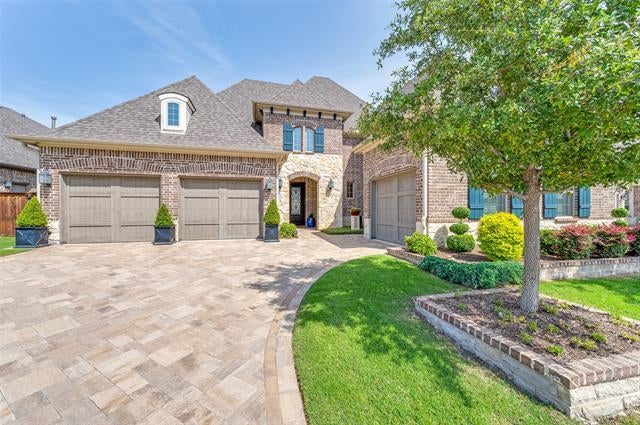 Welcome to 7617 Windsor, a stunning single-story home located in prestigious Waterford Point Village of The Tribute—a resort-style, lakeside, and golf community in the heart of North Dallas. Situated on an oversized lot with no rear neighbors, this home backs to scenic green space and miles of trails, offering privacy and peaceful views of nearby Lake Lewisville. Luxury is evident from the moment you arrive, with brick and stone elevation, stone-paved driveway, lush landscaping, and wrought iron front door that sets the tone. Inside, a bright, airy entry welcomes you with wide plank wood floors, crown molding, upgraded lighting, and custom woodwork that continues throughout the home. The chef’s kitchen is both stylish and functional with an oversized island, granite countertops, and stainless steel appliances including gas cooktop, double oven, built-in microwave, and refrigerator. Floor-to-ceiling custom cabinetry with glass-front uppers, under-cabinet lighting, and decorative pendant lights complete this impressive space. Primary suite is a serene retreat featuring rich wood floors, tray ceiling with chandelier, and wall of windows overlooking the backyard. Spa-like bath includes dual granite vanities, framed mirrors, a dedicated makeup area, and elegant lighting. All secondary bedrooms offer plush carpet, oversized walk-in closets, and ensuite baths. Outdoor living is a highlight with extended covered patio featuring vaulted wood-paneled ceiling, cedar beams, remote screen, stone fireplace, mounted TV, built-in grill, and prep station. Custom stone island is ready for your smoker, making this a perfect space for entertaining year-round. This home offers unmatched attention to detail, premium finishes, and access to exclusive amenities—fitness center, infinity pool, clubhouse, and events—making it a true standout in The Tribute. Don’t miss your opportunity to own this one-of-a-kind home, thoughtfully upgraded with luxury, comfort, and lifestyle in mind.